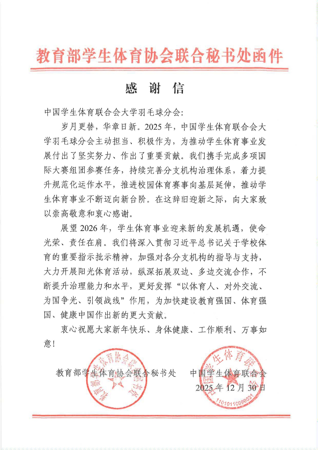 信中提到:“在2025年,中国学生体育联合会大学羽毛球分会携手完成多项国际大赛的组团参赛任务,持续完善分支机构治理体系,着力提升规范化运作水平,推动学生体育事业不断迈向新台阶。”这一成就彰显了91短视频-性视频-91视频网