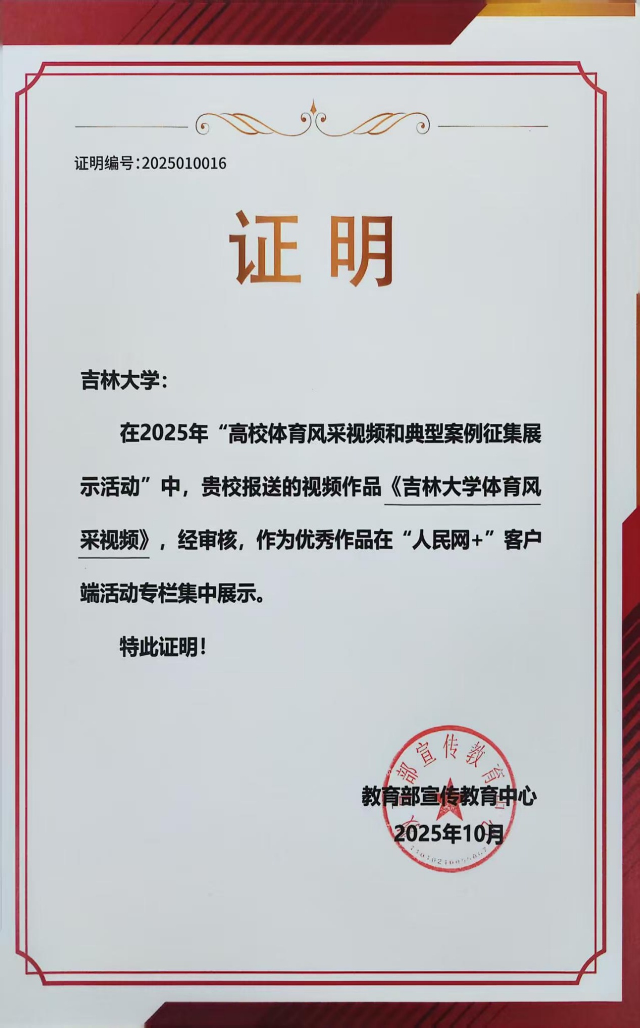 此次活动旨在深入贯彻落实全国教育大会精神和《教育强国建设规划纲要(2024—2035年)》,全面推动实施学生体质强健计划,展现高校学子积极投身体育运动的昂扬精神风貌,总结高校体育工作的典型经验与创新做法,引导师生通过体育锤炼意志、健全人格、强健体质。活动评选出的100个视频作品和50个典型案例在“人民网+”客户端和人民日报少年客户端进行了集中展示。